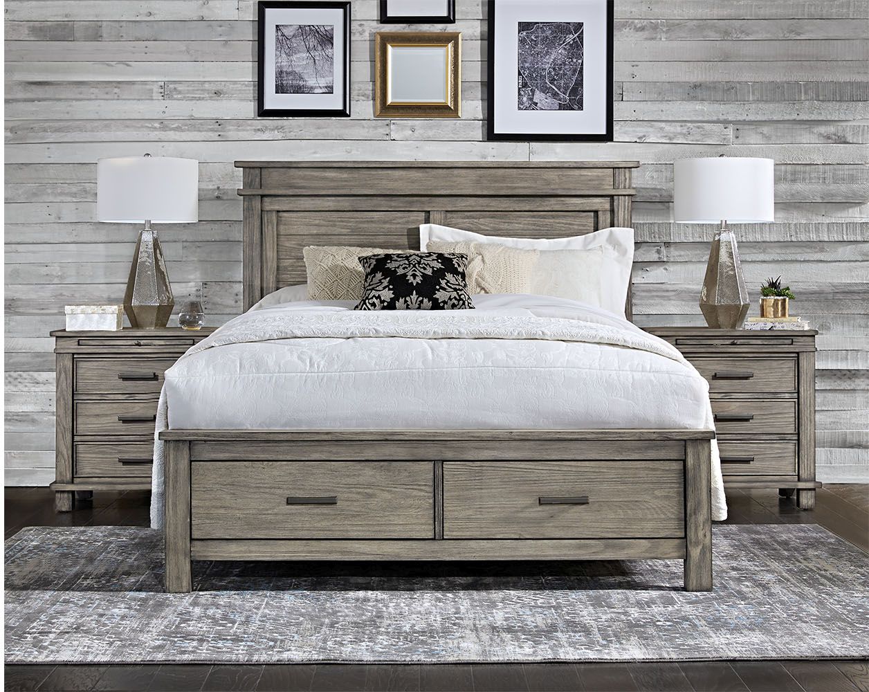 Rustic made refined. The Glacier Point bedroom set is crafted from solid reclaimed pine. Each piece is carefully designed with function and style. This collection embraces a minimalist approach and the perfect shade of sophisticated grays. Functionality is a highlight with ample storage in the solid drawer boxes constructed with ball bearing drawer glides. The nightstands have been designed with the modern convenience of USB charging ports. Available with storage or non-storage bed frames, the Glacier Point bedroom allows you to create a space that is soothing and transitional with a designer look.