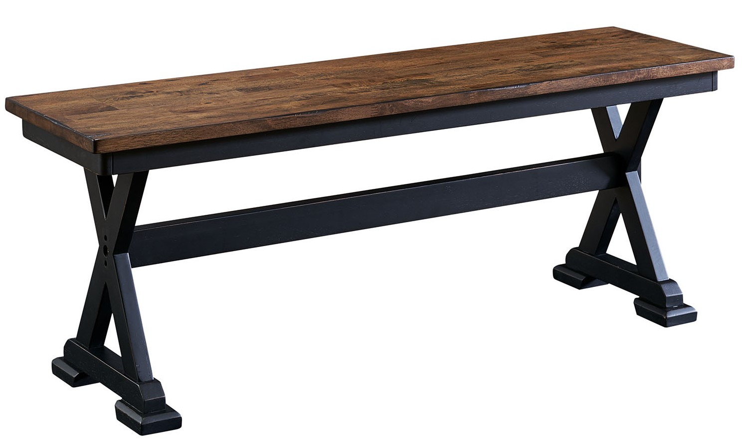 Stone Creek invites warm hospitality to the dining room with its practical farmhouse style. Design details such as the hourglass-inspired trestle on both the table and bench are reproduced in the x-shapes gracing the sideboard doors. Pronounced distressing in the chicory finish mimics the look of time-worn wood that is contrasted by the soft slate black paint recalling faint chalky memories of a by-gone era.