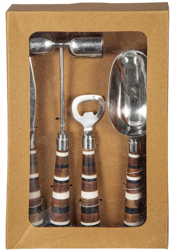 Featuring a peg measure, ice scoop, cheese knife, and bottle opener, this set of four barware items allows you to introduce a consistent modern style to your home without spending the time and effort to look for matching decor.Read More