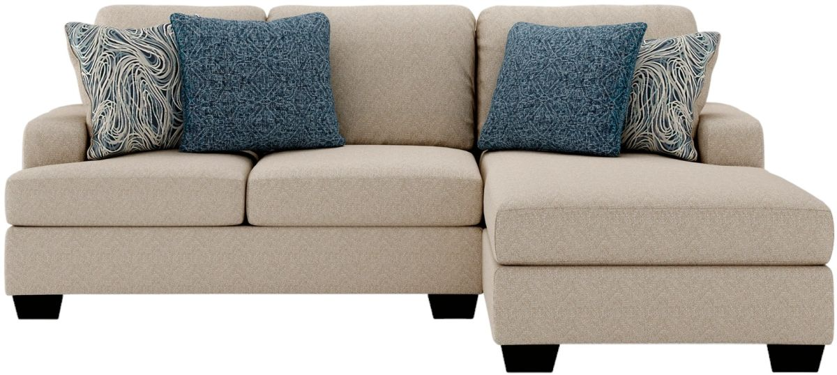 Establish a modern comfort zone with this 2-piece sectional. Spacious seating hosts reversible cushions and cozy back pillows for supportive comfort. Upholstered in sepia-colored polyester fabric, this sectional's frame is minimalistic with low track arms and short faux wood feet. Designer pillows pop with colorful patterns to round out the inviting look.Read More