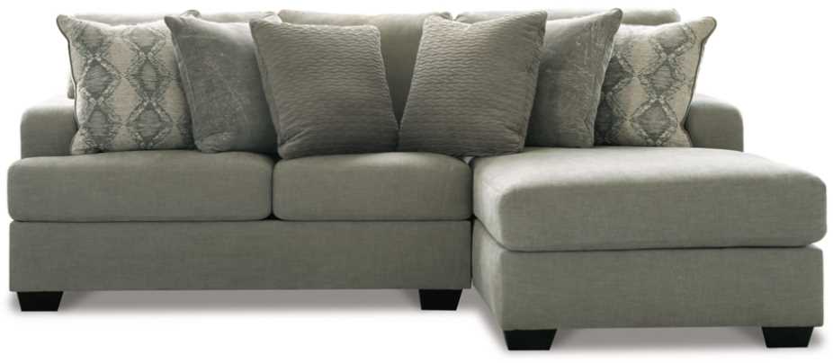 Immerse yourself in comfort with plush, deep cushions and textured throw pillows in soft gray hues. Reversible cushions allow flexibility and help extend the life of this piece. The chaise offers extra leg room for stretching out and space for additional seating.