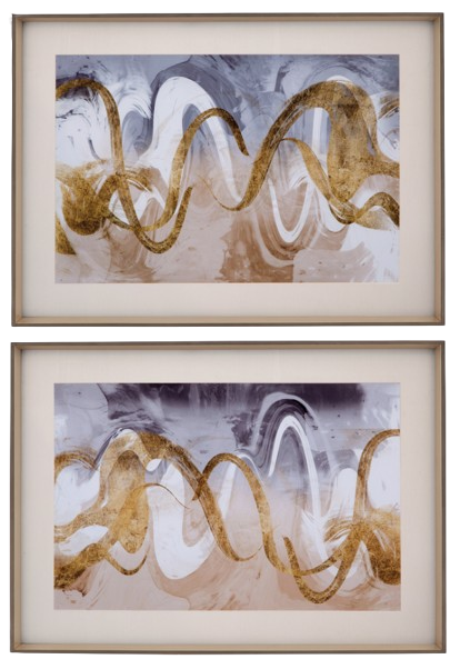 This 2-piece set of prints are abstract waves with gold and steel blue tones with cream matting and two-toned gold and silver wood frame