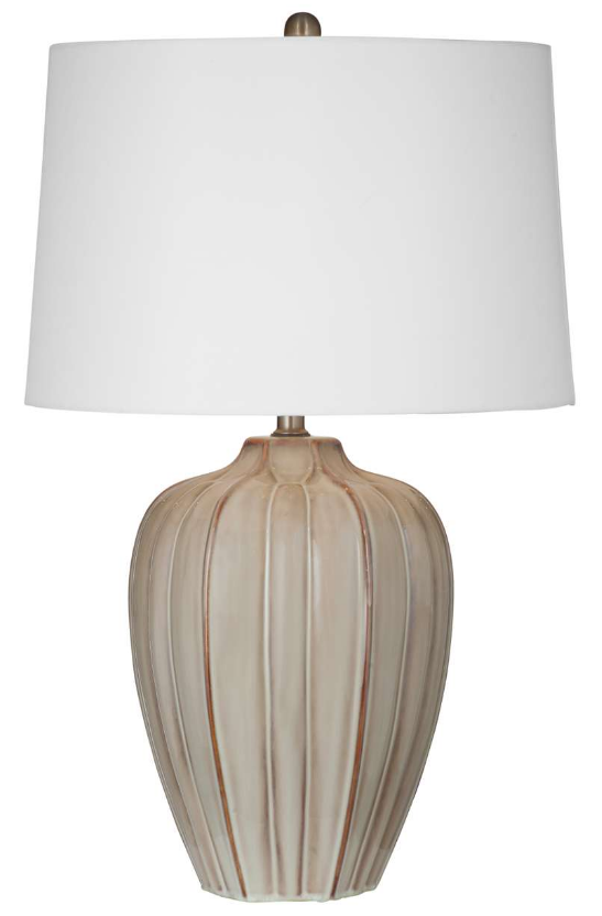 The beige ceramic lamp base provides a modern traditional aesthetic