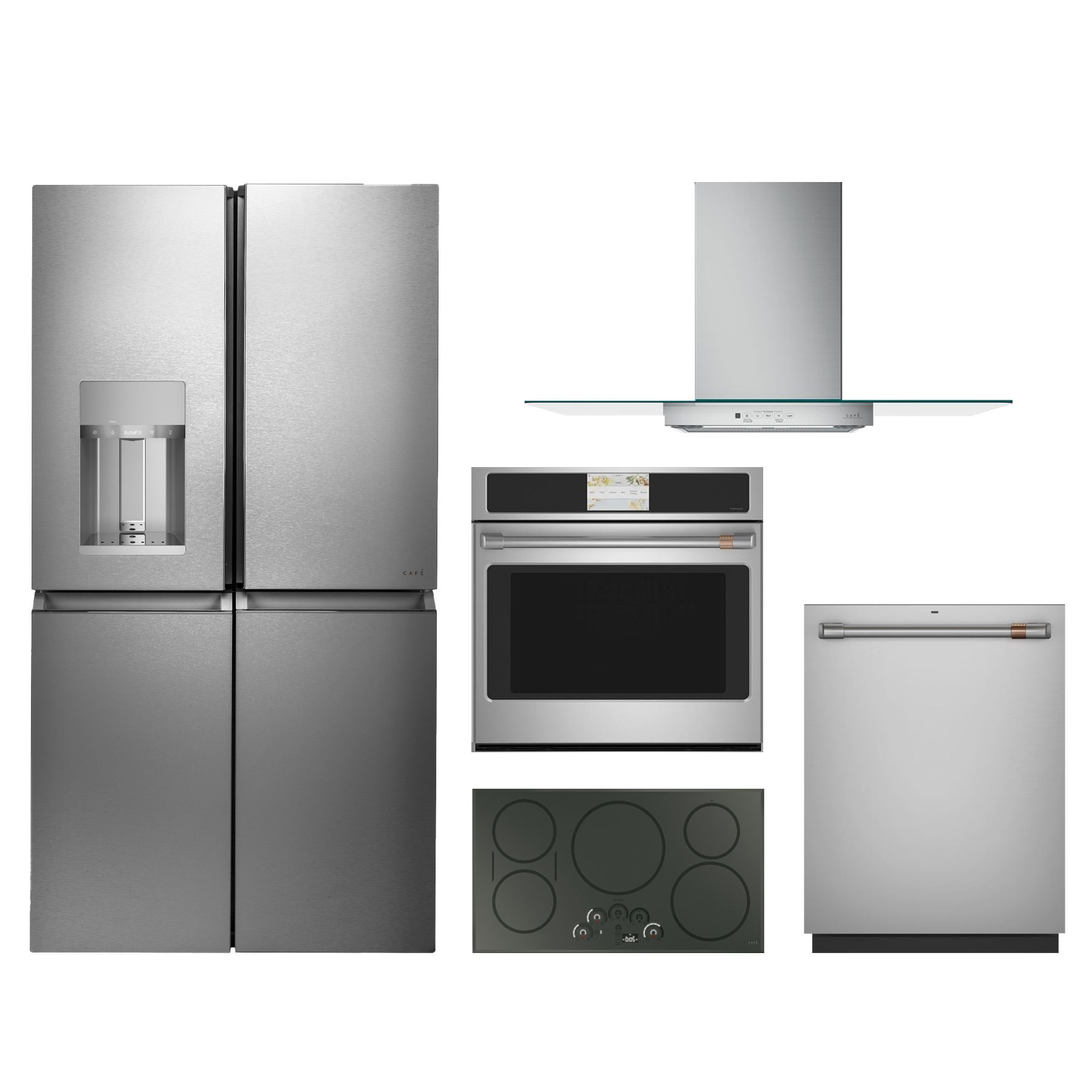 Café™ 5 Piece Kitchen Package with a french door refrigerator, electric cooktop, single wall oven, built in dishwasher, and range hoodRead More