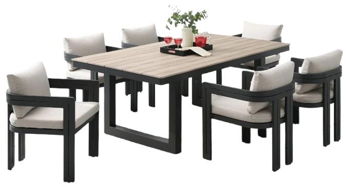 The high-density polywood table features a stylish two-tone design, adding a contemporary touch to your patio décor. The comfortable beige seat and back upholstery provides a cozy seating experience, while the dining table includes an umbrella hole with a cap cover for added convenience. The intricate chair backs add an elegant flair to the overall setting. This group is perfect for hosting outdoor gatherings and is designed to make entertaining a breeze. Enjoy endless summer nights in style with the Costa 7PC Patio Dining Set.