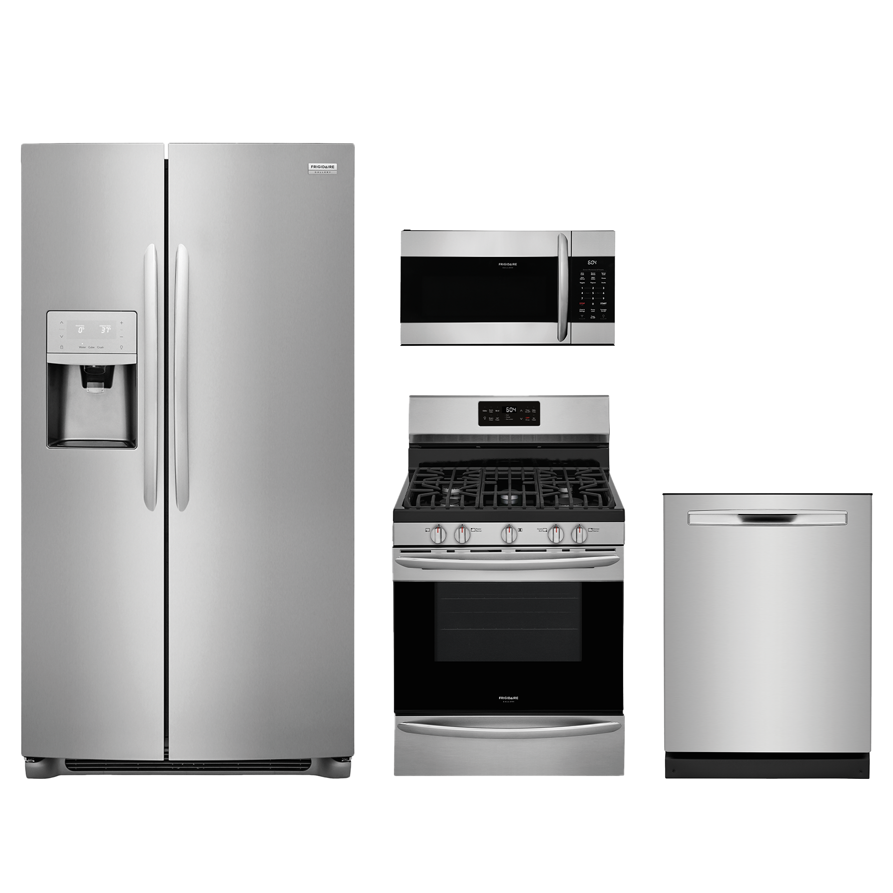 Frigidaire Gallery® 4 Piece Stainless Steel Kitchen Package with side by side refrigerator, free standing gas range, built in dishwasher and over the range microwaveRead More