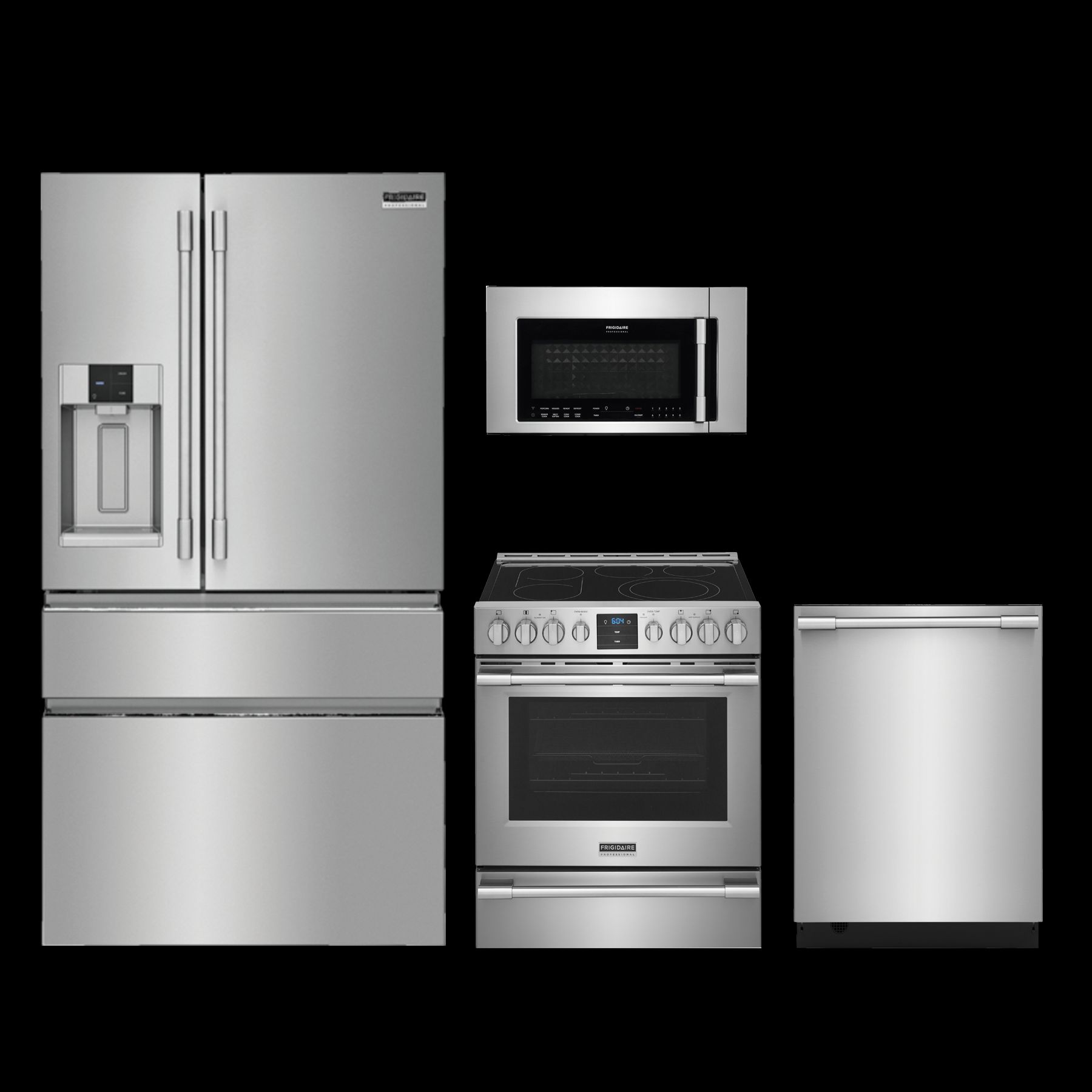 Frigidaire Professional® 4 Piece Kitchen Package-Stainless Steel with counter depth french door refrigerator, free standing electric range, built in dishwasher, and over the range convection microwave.Read More