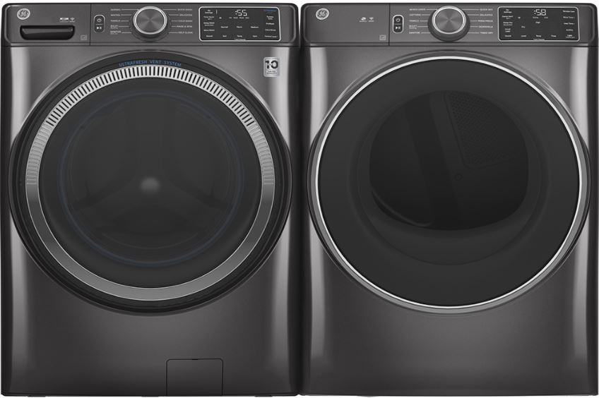 GE® Diamond Gray Front Load Laundry Pair with a 5.5 cu. ft. capacity washer and a 7.8 cu. ft. capacity electric dryer.Read More