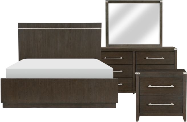 The Bellamy Collection’s intersection of modern lines and transitional appointments makes for a versatile pairing to your bedroom’s décor. The flat panel headboard features an inset mottled silver finished metal accent, it’s finish carrying over to the elongated bar hardware that front the case piece’s drawers. Ash veneer is finished in a dark brown for maximum decorative impact, serving as the perfect canvas to let your decorative flourish reign.Read More