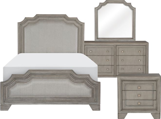 In the Colchester Collection, a modern take on traditional design creates an elegant profile for your bedroom’s décor. The driftwood gray finish of the collection is complemented by the gray fabric and nailhead accent of the headboard and footboard, with silver finished hardware providing complementing contrast to the fronts of the case pieces.Read More