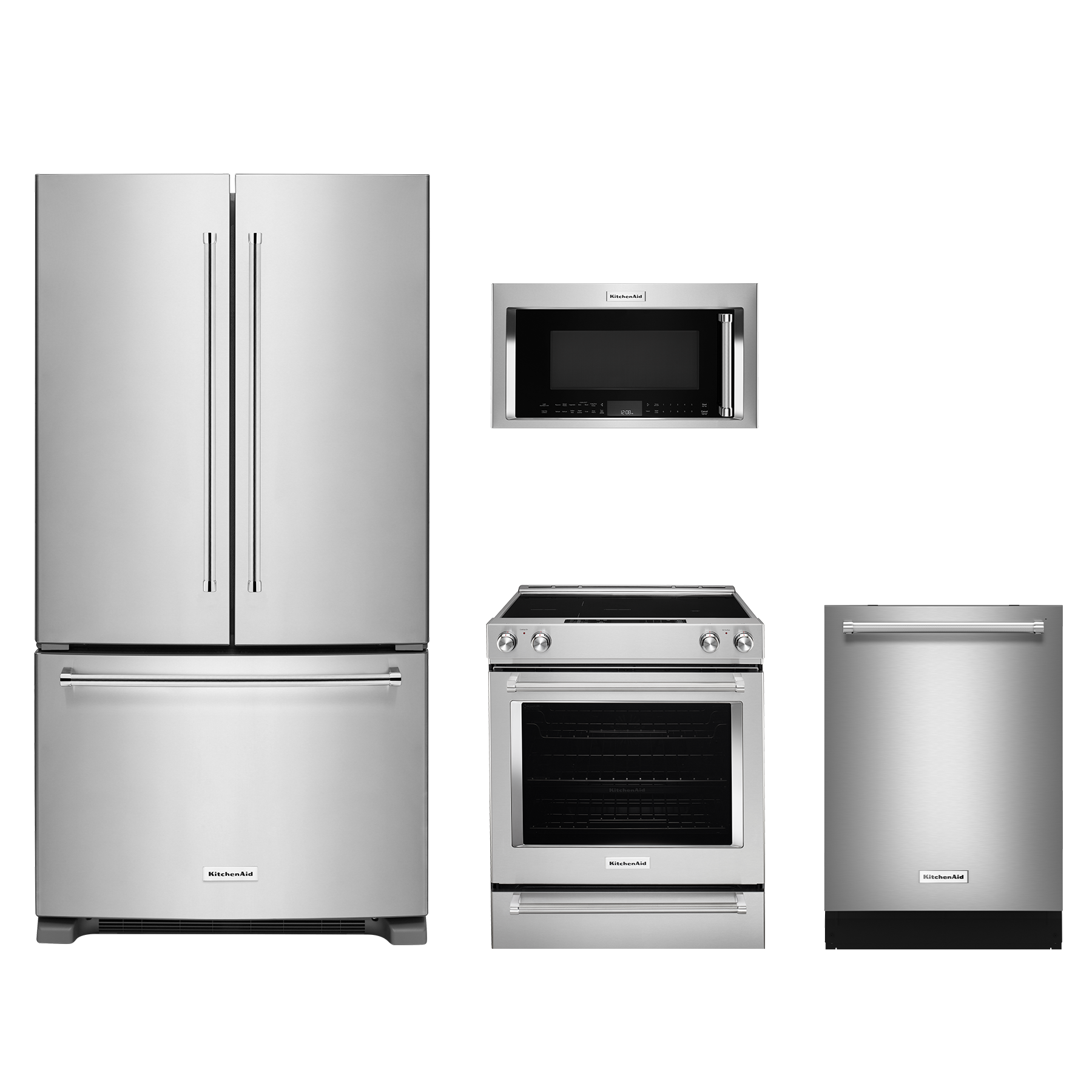 KitchenAid® 4 Piece Kitchen Package-Stainless Steel with a counter depth french door refrigerator, slide in electric range, built in dishwasher and over the range microwaveRead More