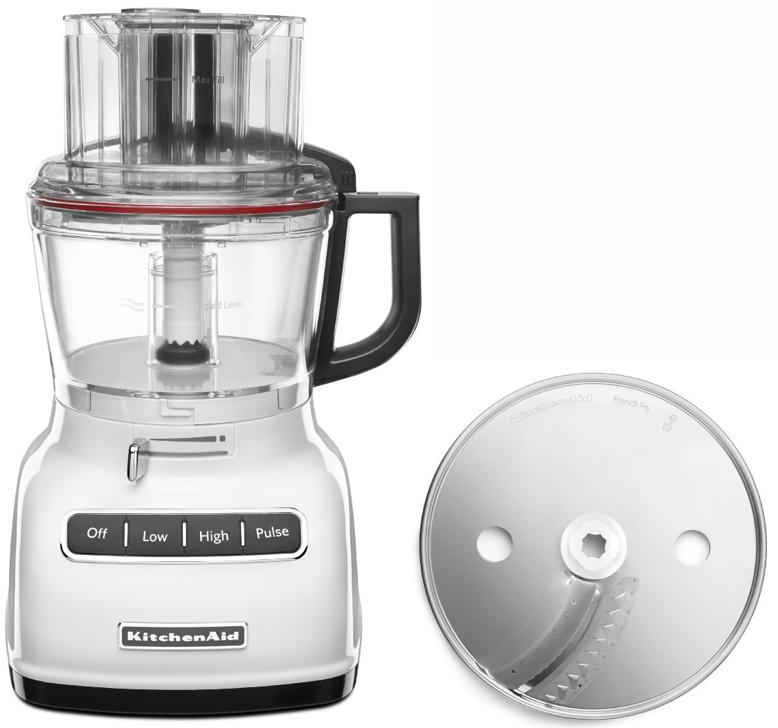 The KitchenAid® 9-Cup Food Processor with the exclusive ExactSlice™ system, slices from thick to thin with one slide of the lever. The multiple optimized speeds and distinctly designed stainless steel blades help in prepping food. Slice, shred, knead, puree and chop food quickly and easily. This model also features a french fry disc.