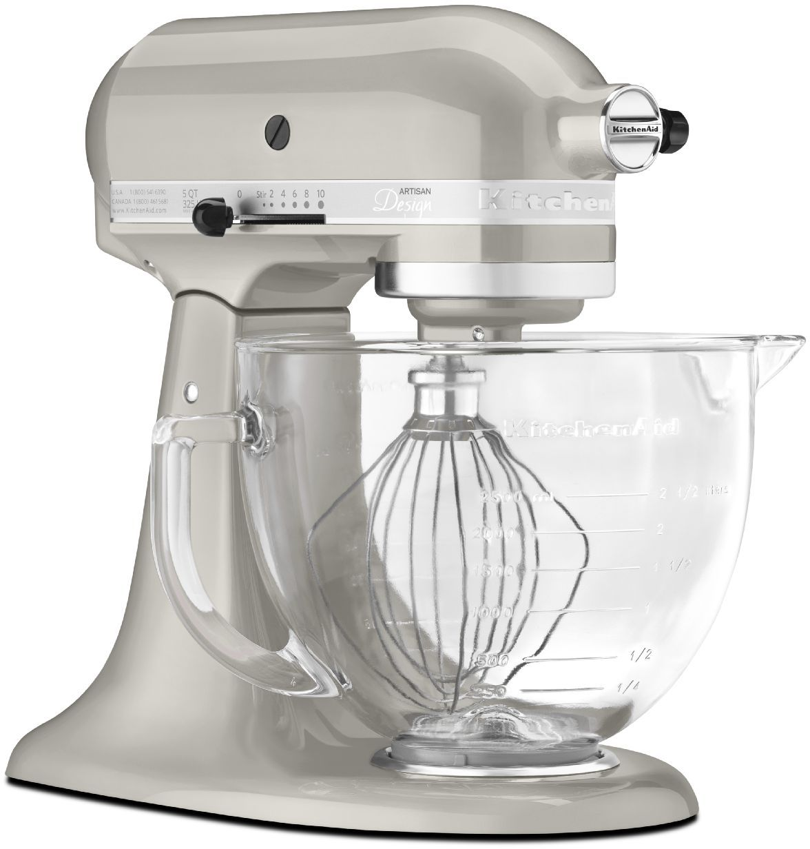 The KitchenAid® Artisan® Design Series 5 Quart Tilt-Head Stand Mixer features a premium metallic finish and elegant glass mixing bowl, adding radiance to any kitchen. It also offers the capacity to make up to 9 dozen cookies in a single batch and 10 speeds to thoroughly mix, knead and whip ingredients quickly and easily. For even more versatility, use the power hub to turn your stand mixer into a culinary center with over 10 optional hub powered attachments, from food grinders to pasta makers and more.Read More