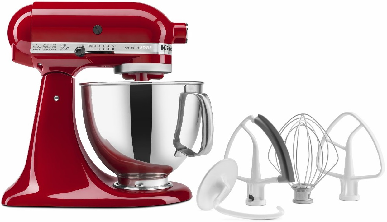 Make up to 9 dozen cookies in a single batch with the KitchenAid® Artisan® Series 5 Quart Tilt-Head Stand Mixer. In addition to the standard accessories included, this mixer includes a flex edge beater, which thoroughly mixes ingredients and scrapes the sides of the bowls. It also features 10 speeds to thoroughly mix, knead and whip ingredients quickly and easily. For even more versatility, use the power hub to turn your stand mixer into a culinary center with over 10 optional hub powered attachments, from food grinders to pasta makers and more.Read More