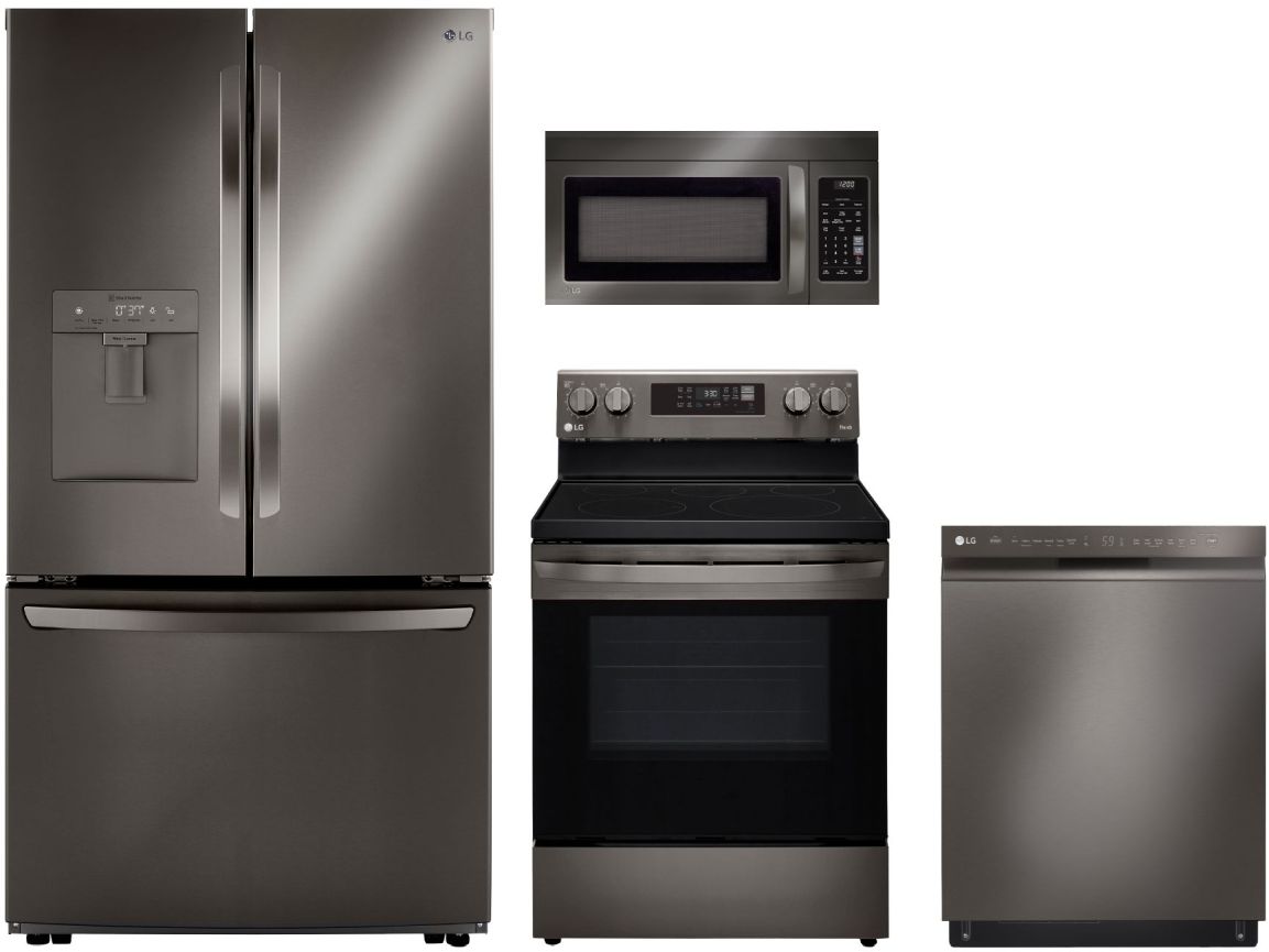 LG 4 Piece Black Stainless Steel Kitchen Package with french door refrigerator, free standing electric range, built in dishwasher and over the range microwaveRead More