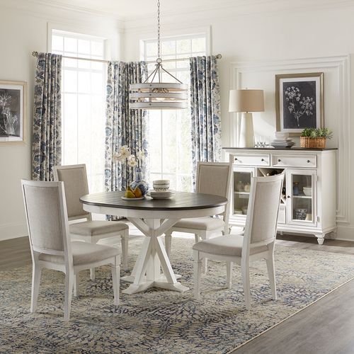 Sitting pretty with the Allyson Park alternate five-piece pedestal table set. Crafted of pine solids and veneers with a cathedral white oak top, this set features wire brushed white finish and a wire brushed charcoal top. This set consists of the pedestal table and four upholstered side chairs.Read More