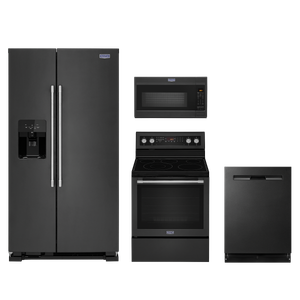 Maytag® 4 Piece Kitchen Package-Cast Iron Black with side by side refrigerator, free standing electric range, over the range microwave and built in diswasherRead More