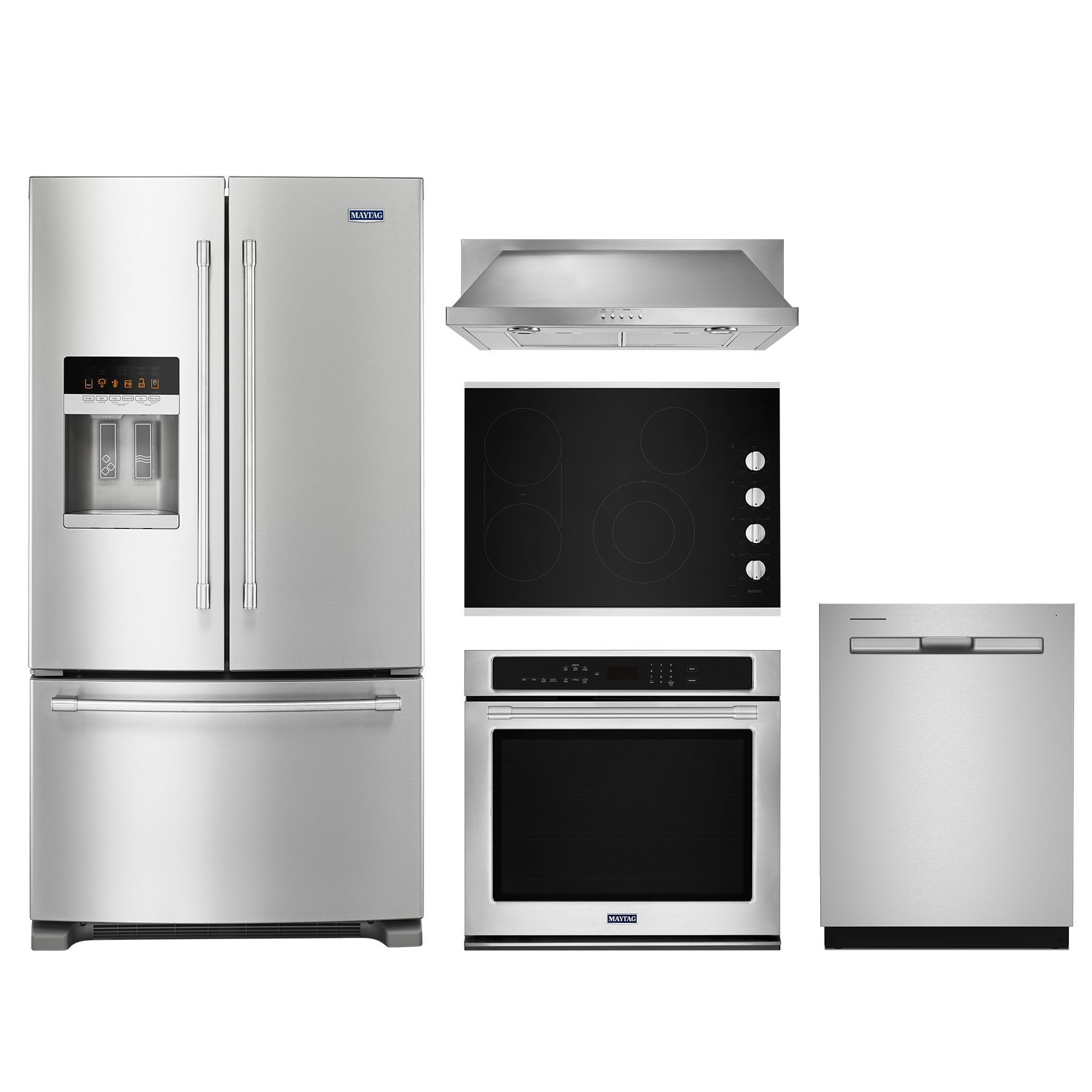 Maytag® 5 Piece Stainless Steel Kitchen Package with a french door refrigerator, electric cooktop, single wall oven, built in dishwasher, and range hoodRead More