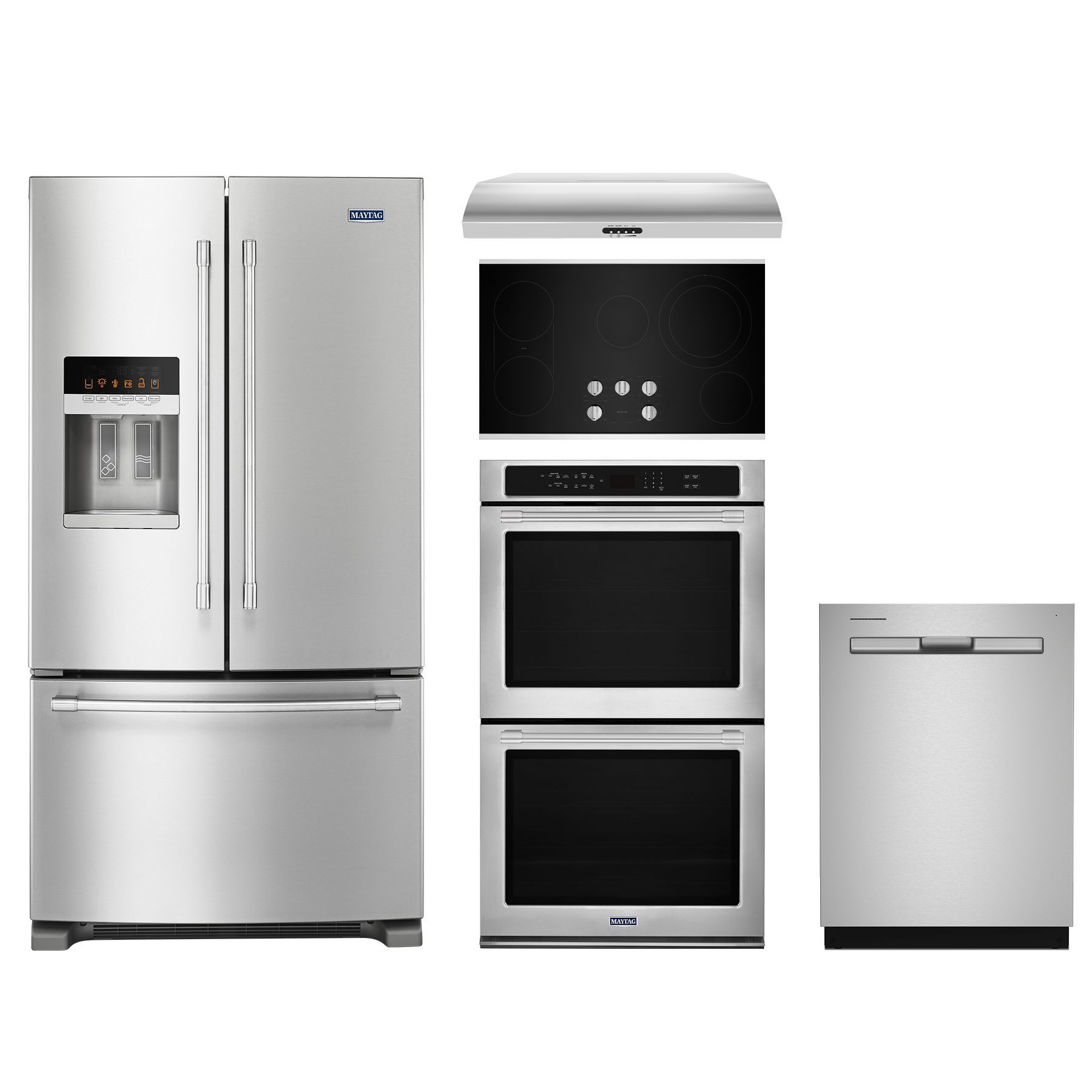Maytag® 5 Piece Stainless Steel Kitchen Package with a french door refrigerator, electric cooktop, single wall oven, built in dishwasher, and range hoodRead More