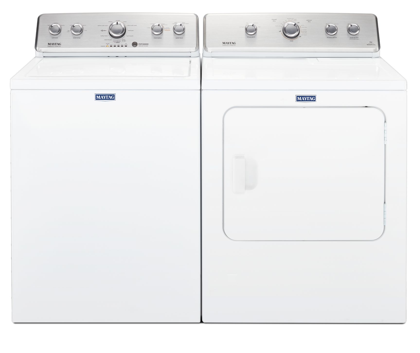 Maytag® White Laundry Pair with a 3.8 cu. ft. capacity top load washer and a 7.0 cu. ft. capacity front load electric dryer.Read More