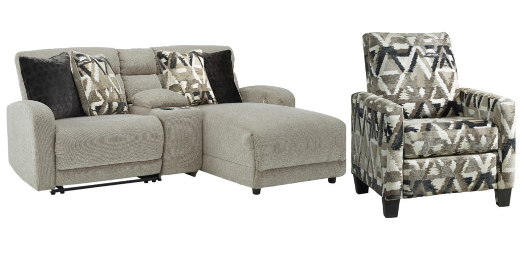 The sectional is wrapped in a decadently plush stone-tone fabric for neutral versatility, while the recliner features a highly modern aesthetic with a neutral geometric pattern. This chic set is dressed to impress with a relaxed, contemporary aesthetic.