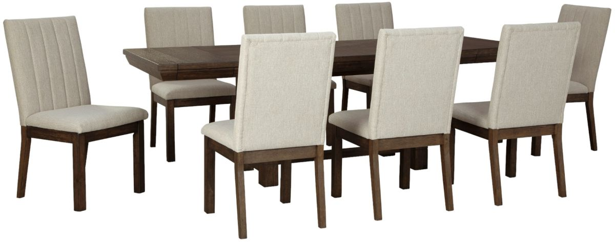 Includes dining table and eight chairs