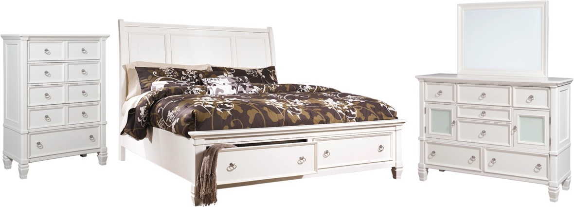 Includes headboard (storage footboard, rails), dresser with mirror and chest of drawers
