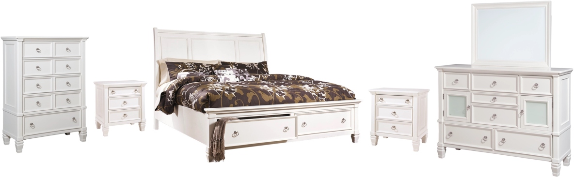 Includes king bed (headboard, storage footboard, rails), 7-drawer dresser with mirror, 5-drawer chest and two 3-drawer nightstands