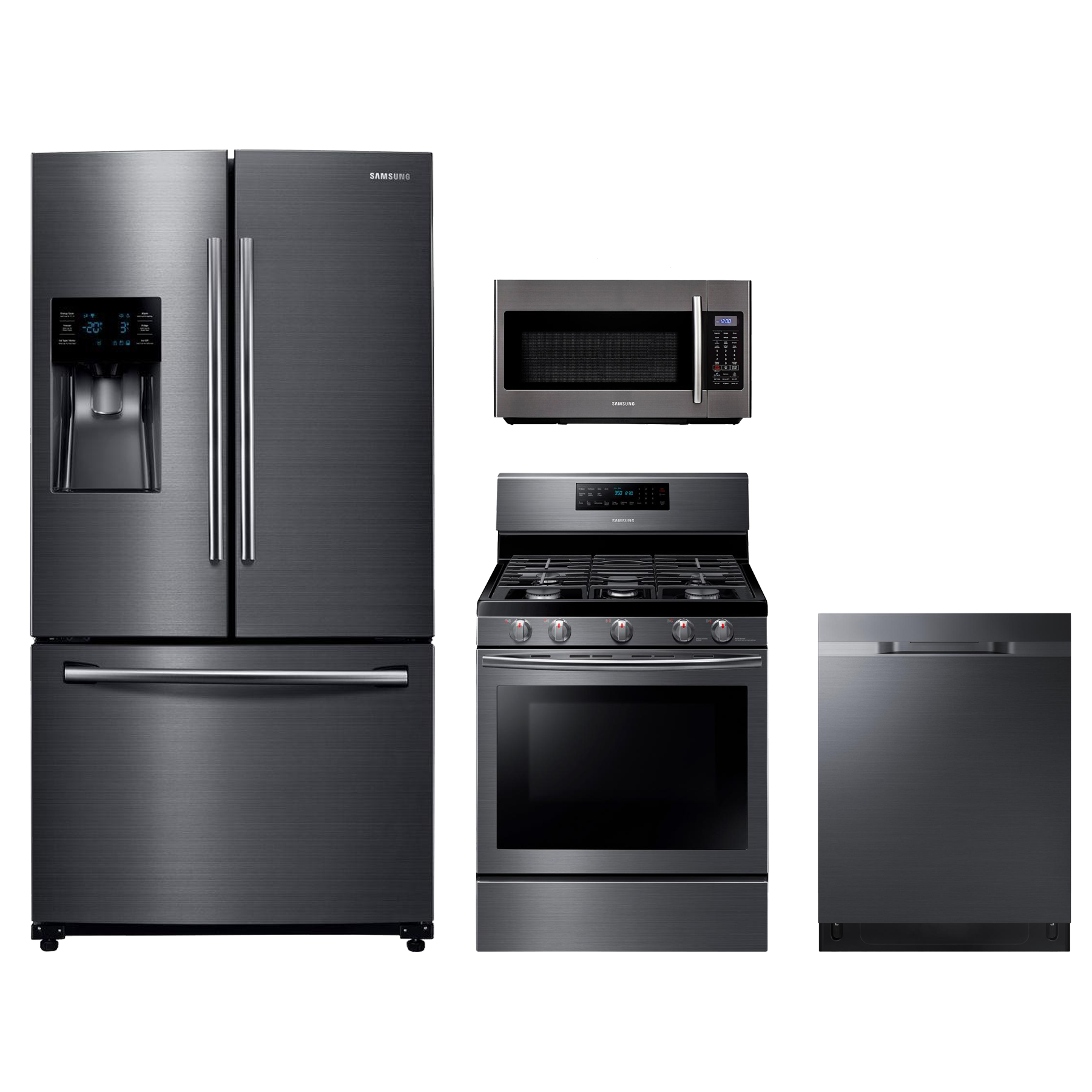 Samsung 4 Piece Black Stainless Steel Kitchen Package with a french door refrigerator, freestanding gas range, built in dishwasher and over the range microwaveRead More