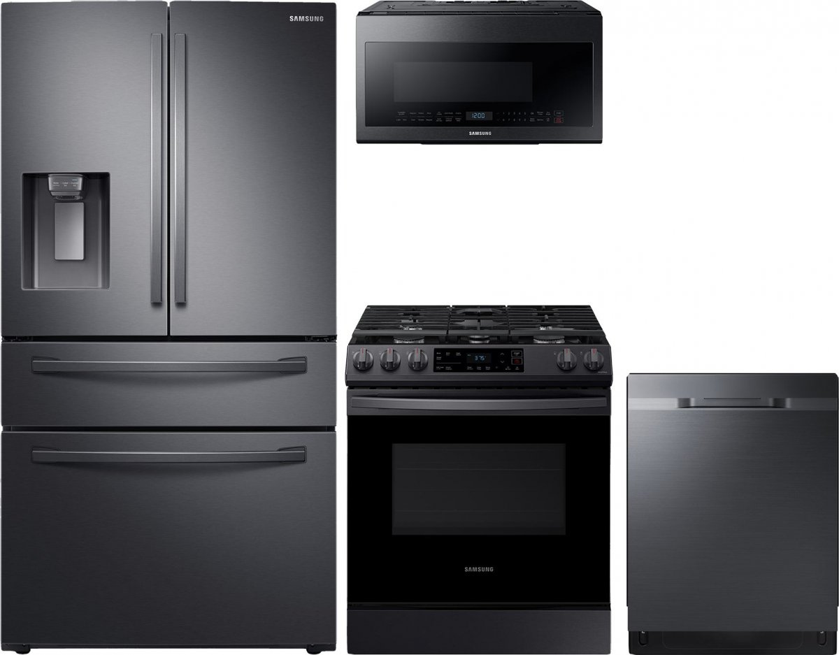 Samsung 4 Piece Fingerprint Resistant Black Stainless Steel Kitchen Package with french door refrigerator, slide in gas range, built in dishwasher and over the range microwaveRead More