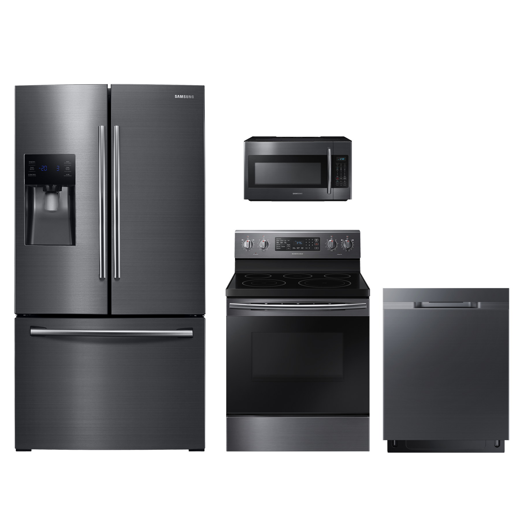 Samsung 4 Piece Kitchen Package-Black Stainless Steel with a french door refrigerator, freestanding electric range, built in dishwasher and over the range microwaveRead More