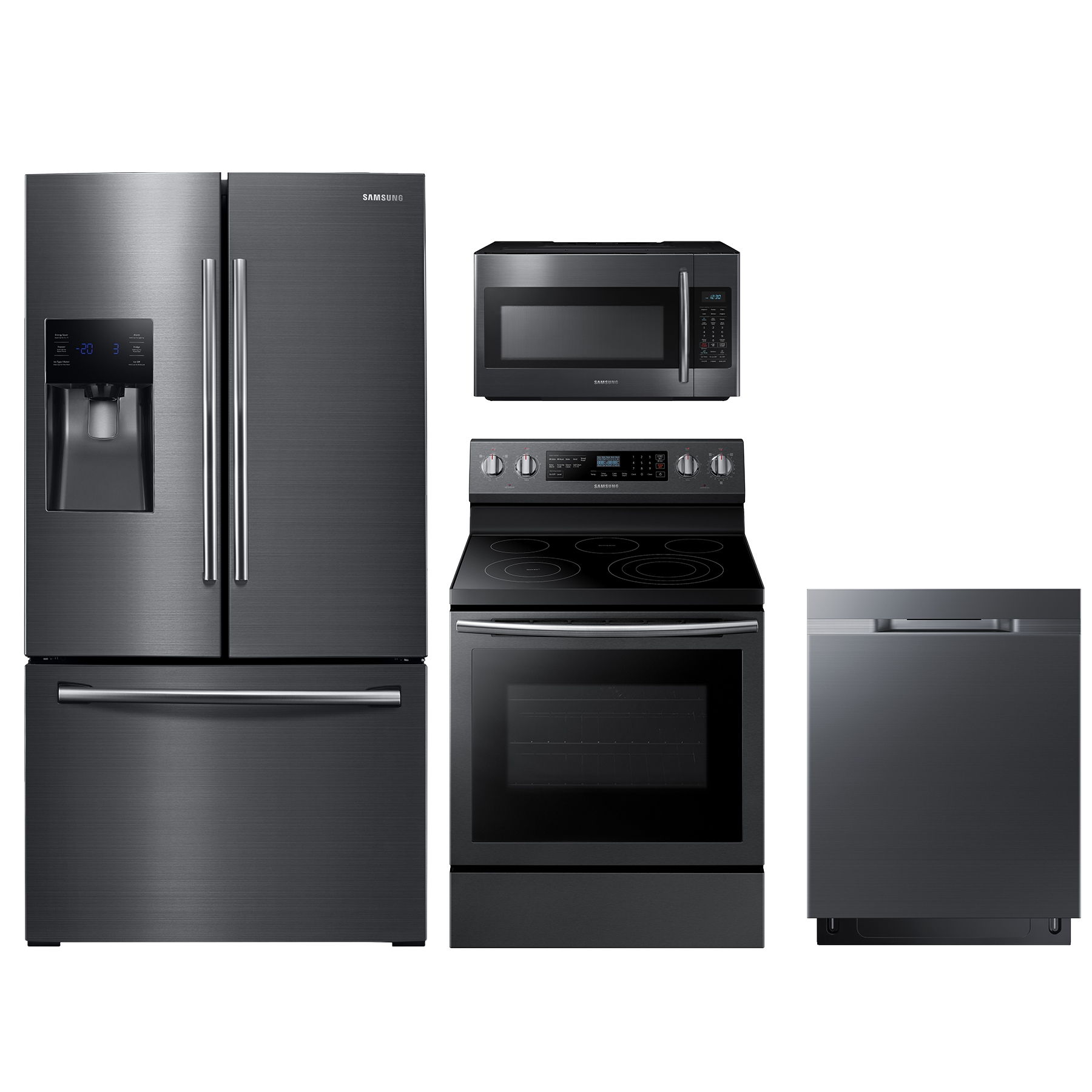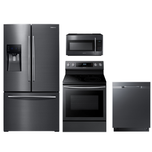 Samsung 4 Piece Kitchen Package-Black Stainless Steel with a french door refrigerator, free standing electric range, built in dishwasher and over the range microwave.Read More