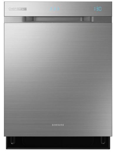 The Samsung Chef Collection dishwasher with WaterWall™ Technology features a stainless steel pocket handle design enhanced by a glowing Ice Blue LED display.