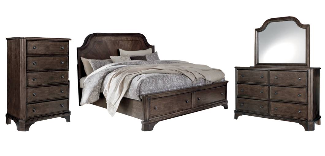 Includes California king panel headboard, storage footboard, rails with roll slats, dresser, mirror and chest of drawers