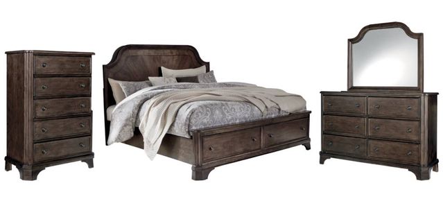 Includes queen panel headboard, storage footboard, rails with roll slats, dresser, mirror and chest of drawers