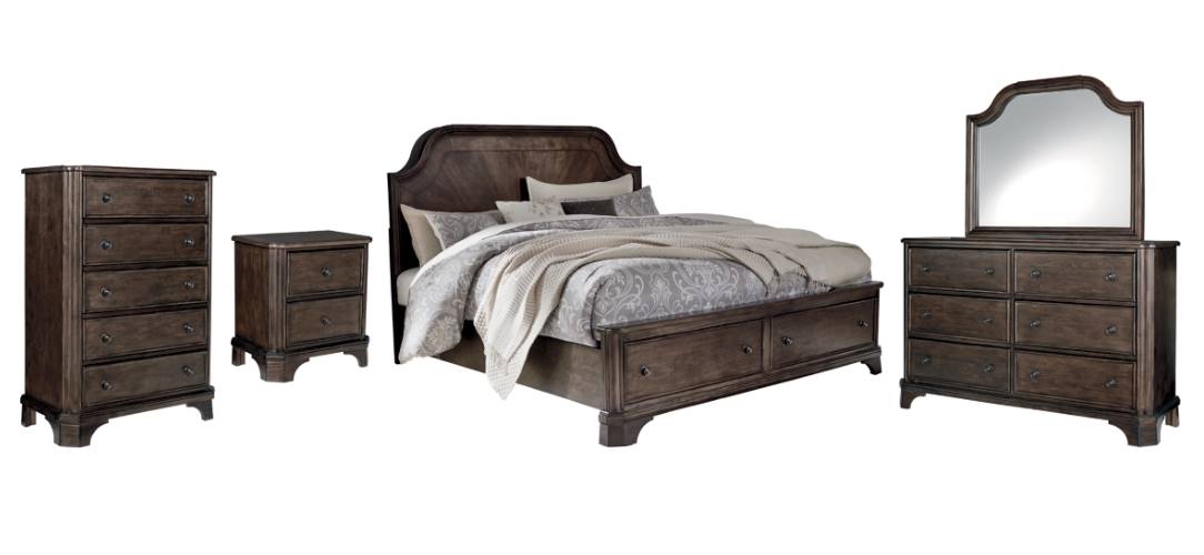 Includes king panel headboard, storage footboard, rails with roll slats, dresser, mirror, chest of drawers and nightstand