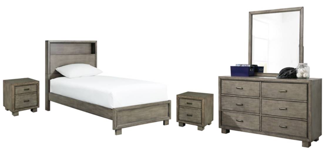 Melding modern and mid-century influences, this bedroom set brings a fashion-forward perspective to bedroom furniture. The set’s ultra clean lines—which include an open gallery-rail headboard, flush-mount drawers and bold, blocky feet—are beautified with a smoky gray finish that’s delightfully distinctive.Read More
