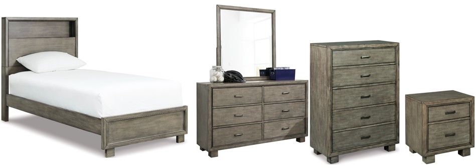 Includes twin bookcase bed (headboard, footboard and rails), chest of drawers, dresser with mirror and nightstand