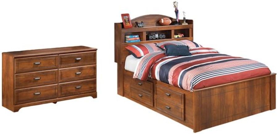 Includes full panel bookcase headboard, footboard, rails with underbed storage drawers, roll slats and dresser