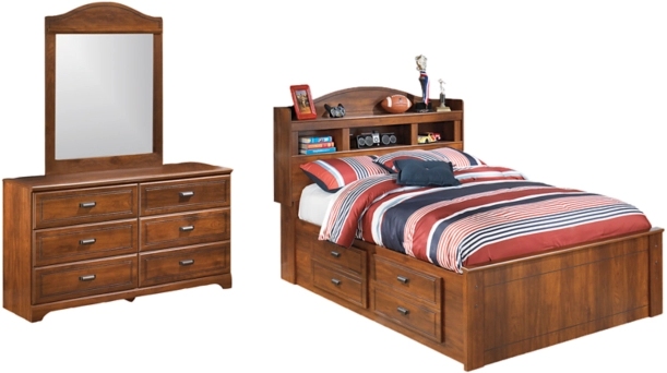 Includes full panel bookcase headboard, footboard, rails with underbed storage drawers, roll slats and dresser with mirror
