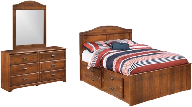 Includes full bed (with headboard, footboard, slats, 2 underbed storage units with side rail) and dresser with mirror