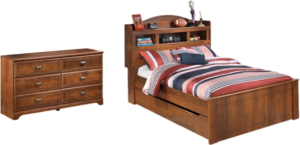 Includes full bed (with bookcase headboard, footboard, rails, slats and trundle storage) and dresser