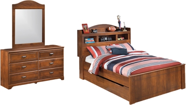 Includes full bed (with bookcase headboard, footboard, rails, slats and trundle storage) and dresser with mirror