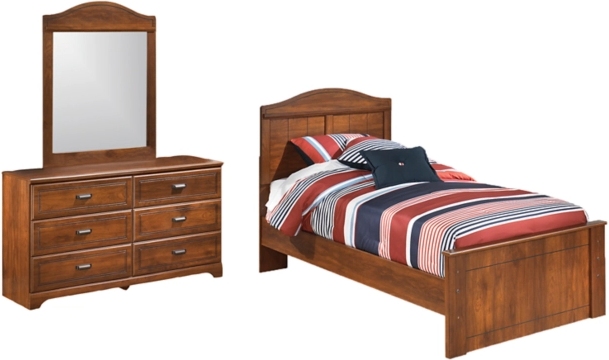 Includes twin panel headboard, footboard, rails and dresser with mirror