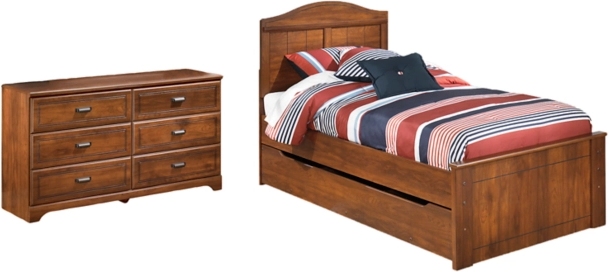 Includes twin panel headboard, footboard, wheeled trundle bed, roll slats and dresser
