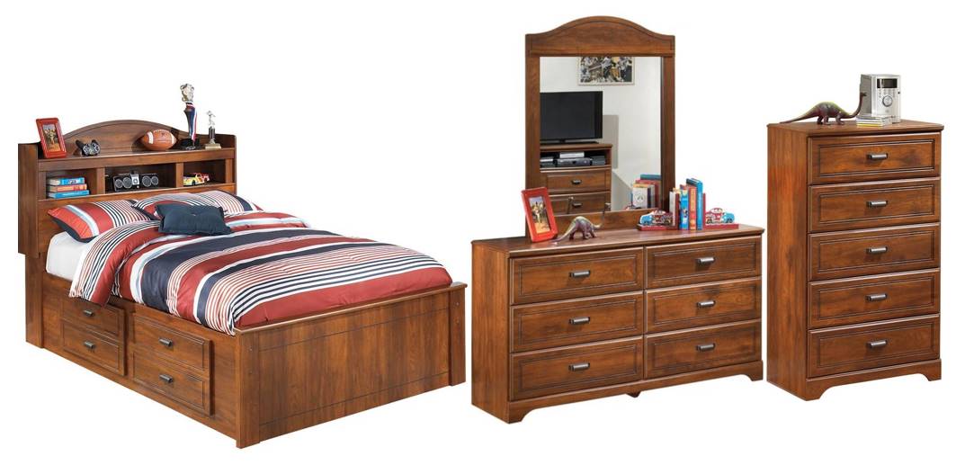Includes full panel bookcase headboard, footboard, rails with underbed storage drawers, roll slats, dresser with mirror and chest of drawers