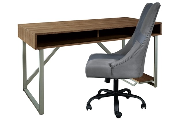 Elevate your style and up your game with the Barolli gaming desk and chair. Clean and contemporary, this ultra-cool mixed media designer desk includes a metal frame in silvertone finish, topped with an engineered wood surface with replicated wood grain.Read More