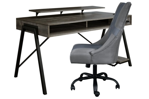 Elevate your style and up your game with the Barolli gaming desk and chair. Clean and contemporary, this ultra-cool mixed media designer desk includes a metal frame in silvertone finish, topped with an engineered wood surface with replicated wood grain.Read More