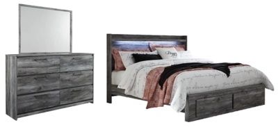 Includes panel bed (headboard, footboard, platform rails and wood roll slats) and dresser with mirror, Made of engineered wood with replicated grain, Footboard with 2 drawers, Headboard with dimmable LED light strip, Power cord included; UL Listed, Included slats eliminate need for foundation/box spring, Mattress available, sold separately, Dresser with 6 smooth-gliding drawers with faux-linen lining, Assembly required