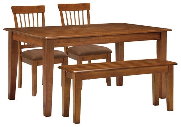 Includes dining table, 2 upholstered dining chairs and a dining bench